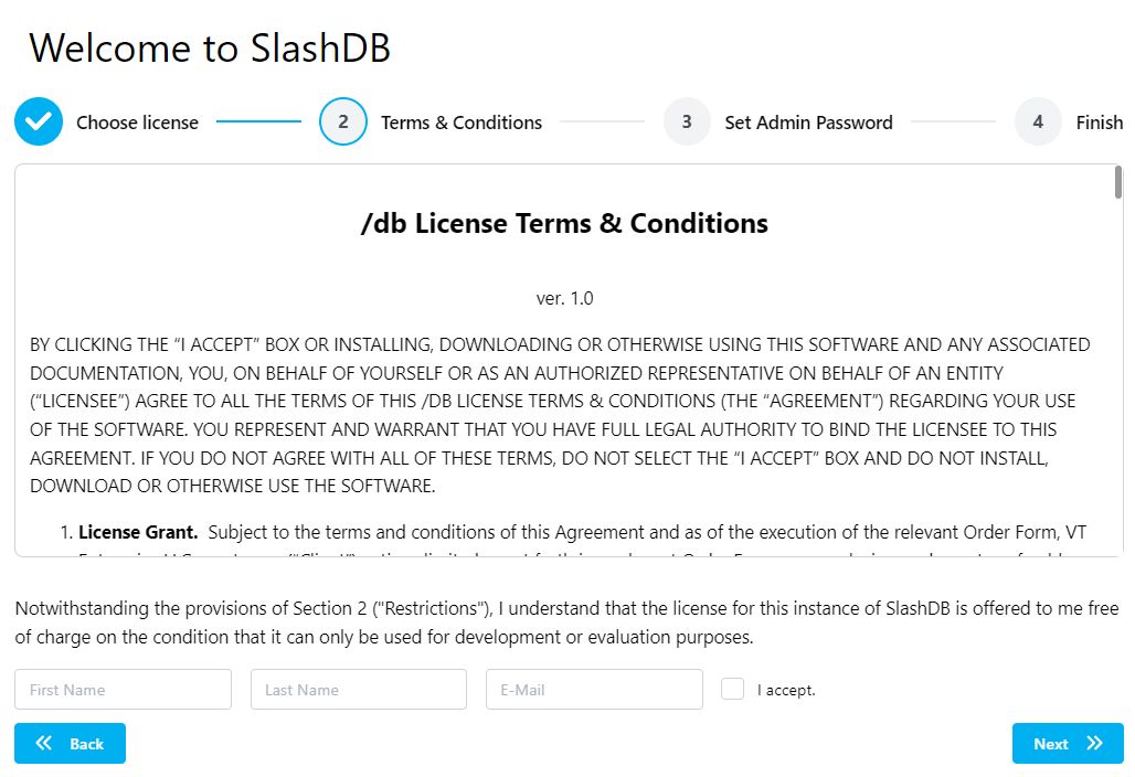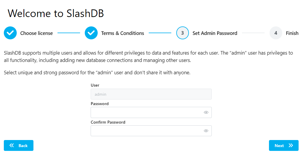 To begin using SlashDB, it must be configured properly. This involves accepting the EULA, choosing a license, and setting the admin user password.