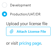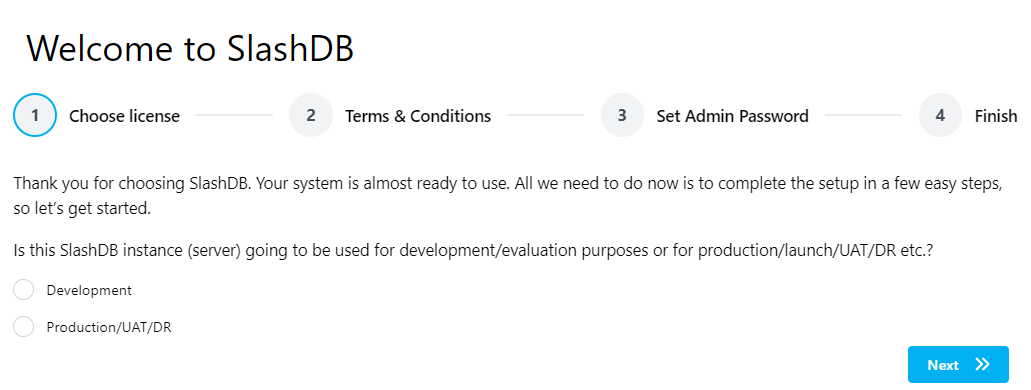 If you are just experimenting with SlashDB, you can choose Development. In all other cases, pick Production/UAT/DR and upload your license key. See the License documentation or the pricing page for more details.