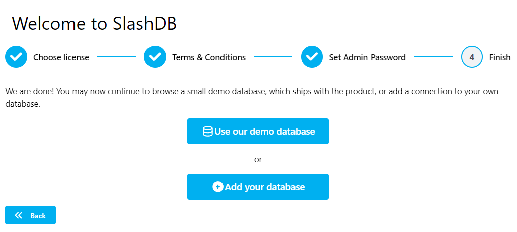 Finally, choose whether to use a prepackaged sample database or configure SlashDB to connect to an existing database. Click on Use our demo database or Add your database.
