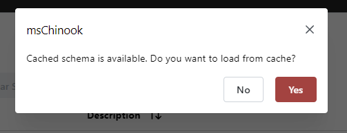 If a cached schema is detected when the connection is initiated, a dialog window will appear asking if you want to use it.