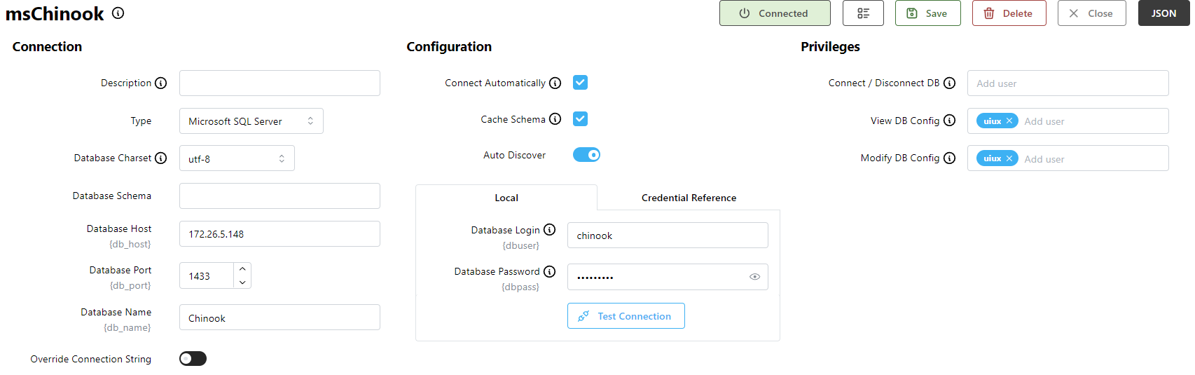 Users with privileges to manage connections will have the Delete button available. This deletes the current connection and returns to the connection list.
