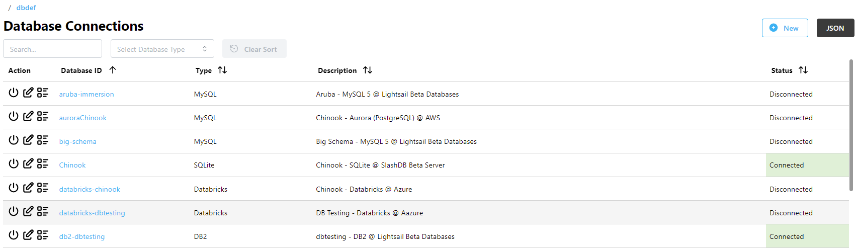 SlashDB's core features center around databases. Both Data Discovery and SQL Pass-thru require connections to databases to function. This documentation will guide you through the process of creating and managing database connections.