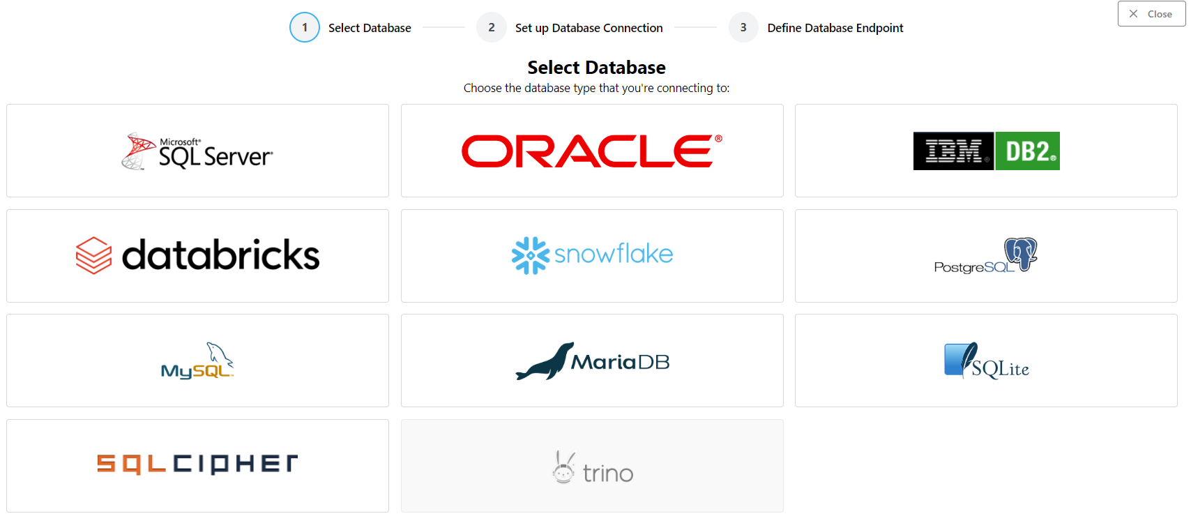 sqlitefor SQLitesqlcipherfor SQLCiphermssqlfor MS SQL Serveroraclefor Oracledb2for IBM DB2mysqlfor MySQL or MariaDBpostgresqlfor PostgreSQLdatabricksfor Databrickssnowflakefor Snowflaketrinofor Trino