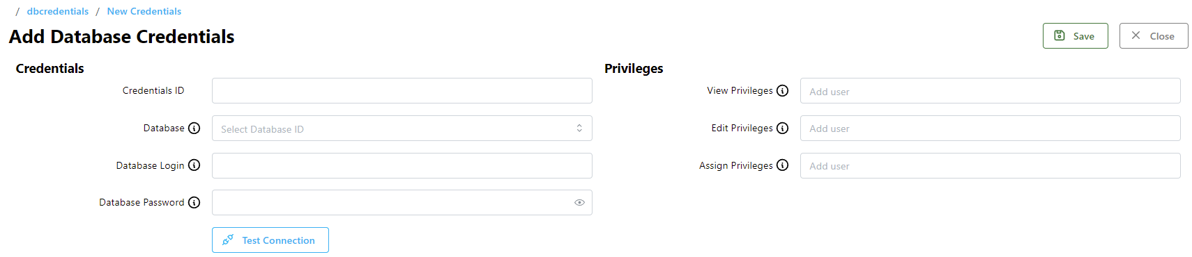 Click the New button on the Database Credentials List to create a new credentials entry. This form is similar to the configuration form but has some extra fields.