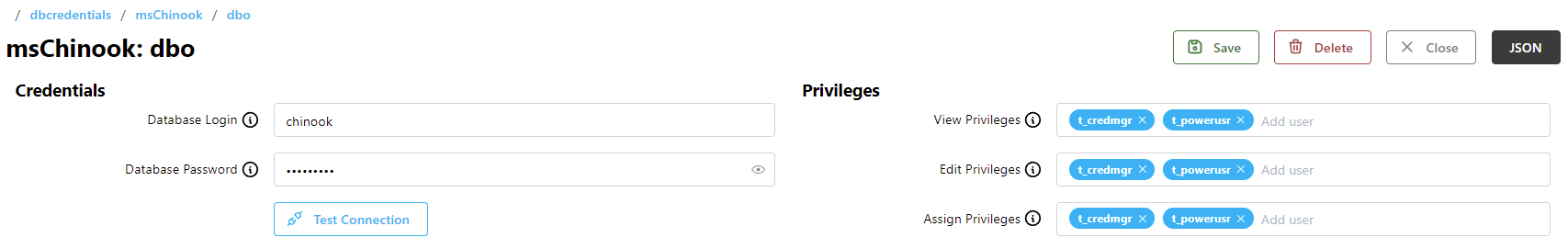 Users credmgr and powerusr have privileges to assign the dbo credentials for the msChinook database