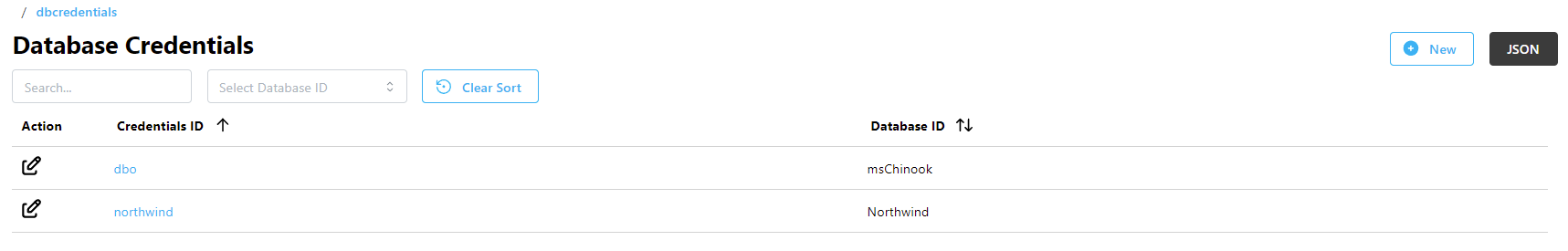 The Database Credentials page provides a list of all credentials that are configured in SlashDB.