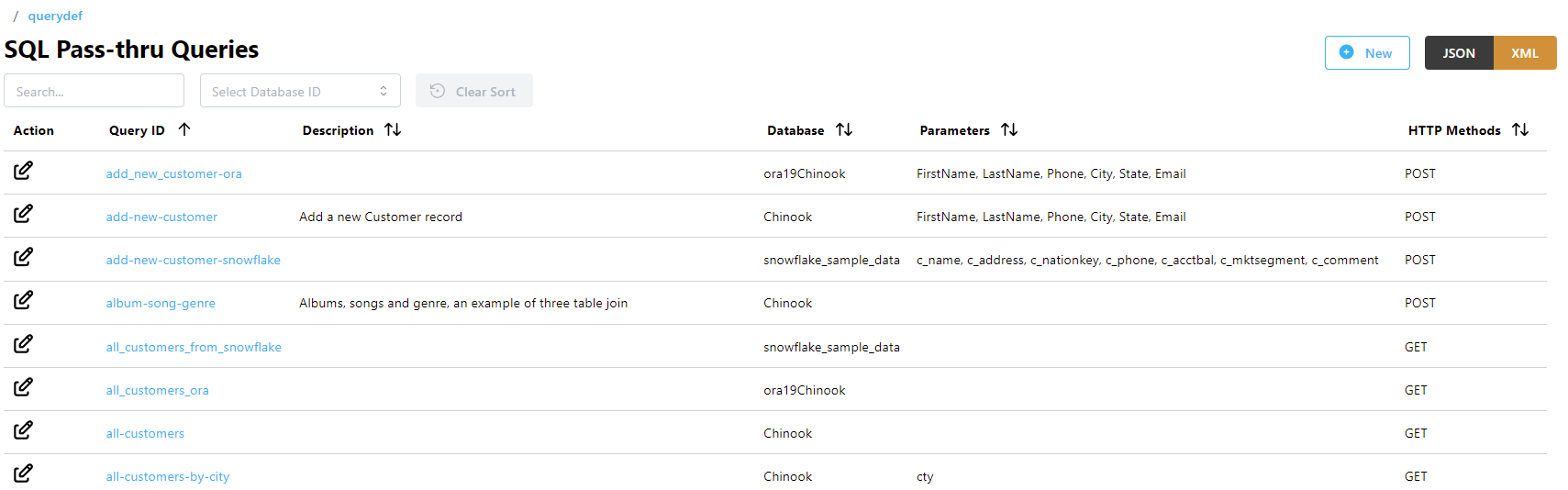 The SQL Pass-thru Queries page provides a list of all the queries that are configured in SlashDB.