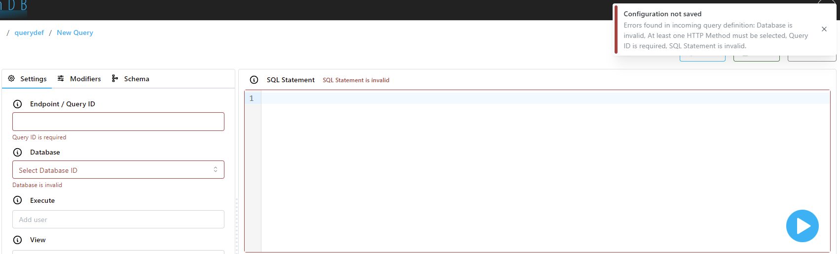 Query configuration errors are shown at the top right corner of the page. They appear if any issues are encountered when peforming a configuration action like saving or deleting a query.