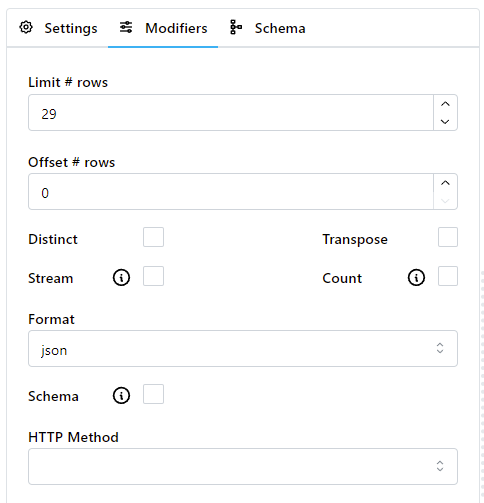 Modifiers let you set options which will affect the query output. The tooltip icons provide information about some of the options.