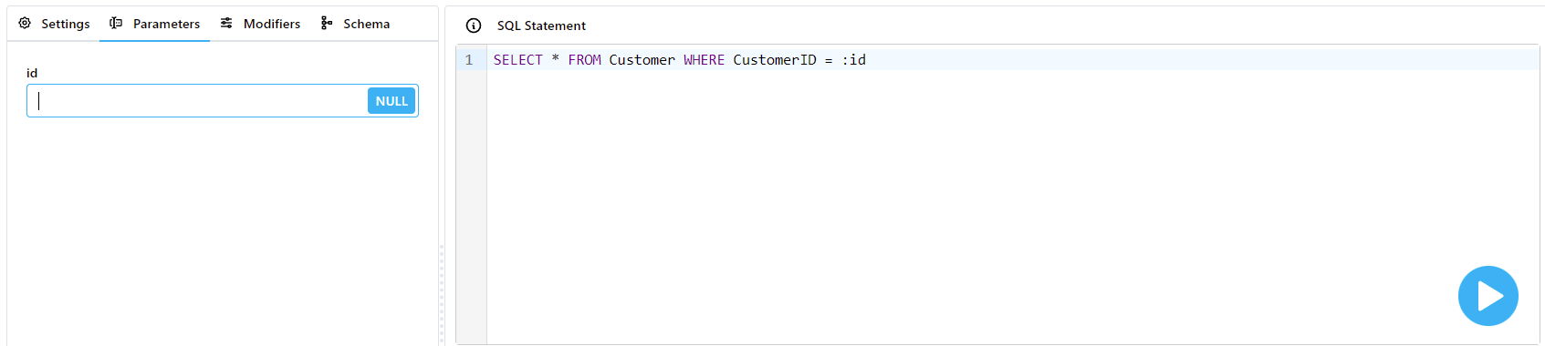 The editor recognizes user-defined variables, which allows you to execute queries with parametrized SQL. When a parameter is detected in the editor, a new tab will appear on the left hand side labeled Parameters.