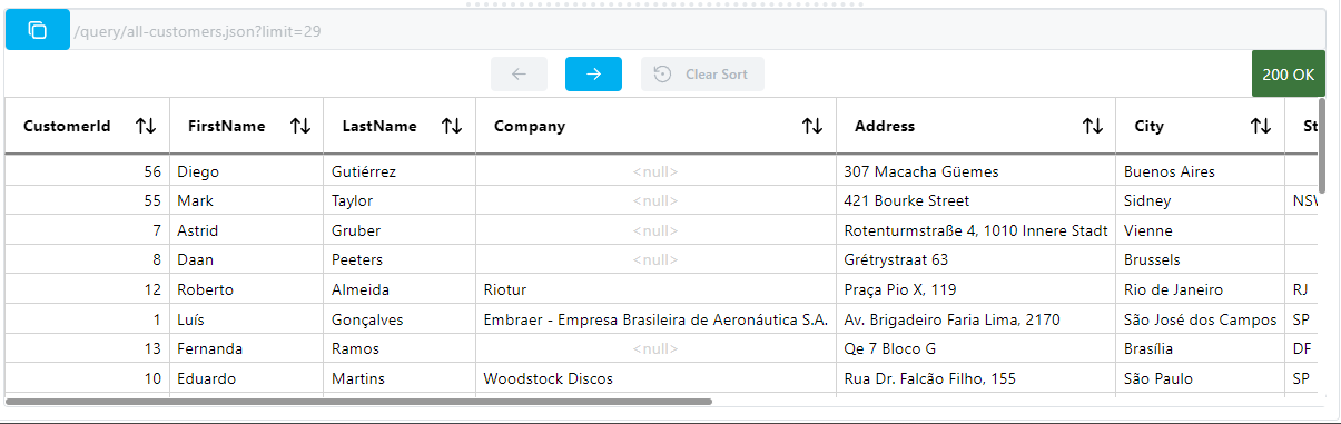 Results from running a query will appear in the output pane. Results appear in a table with sortable column headers.