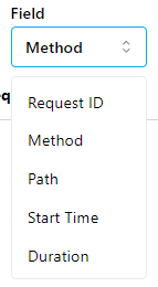 The Option dropdown will change to display the available filtering options for the Method, Start Time, and Duration fields. Use the text input field to enter the value you want to filter against.