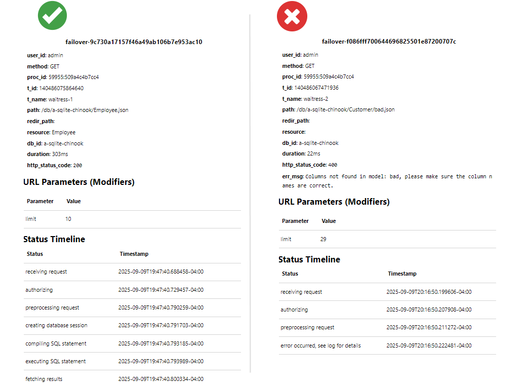 Below are two request details panes; on the left a successful request, on the right a failed request: