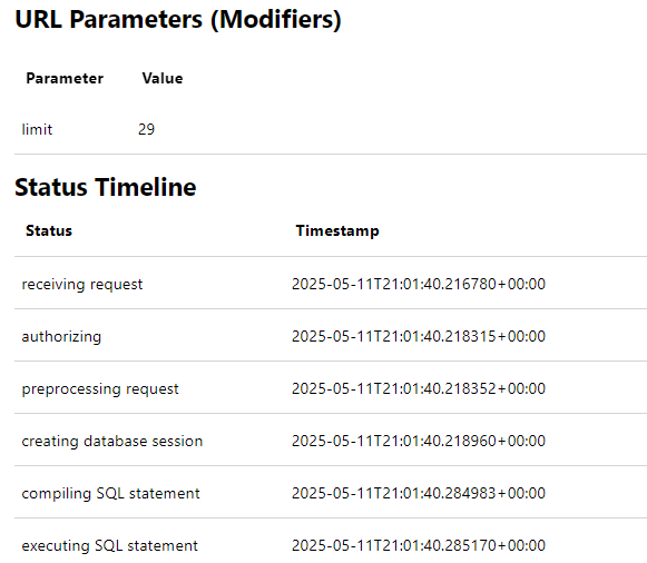Finally, there is a Status Timeline with timestamps, showing each stage of the request as it goes through the execution pipeline.
