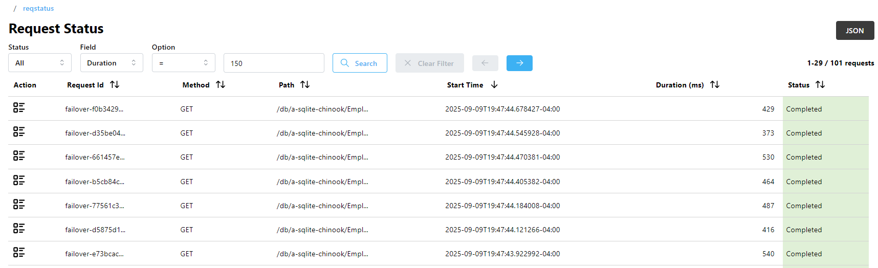 Request ID and Path have no filtering options; just input the value you wish to filter by into the text input field.