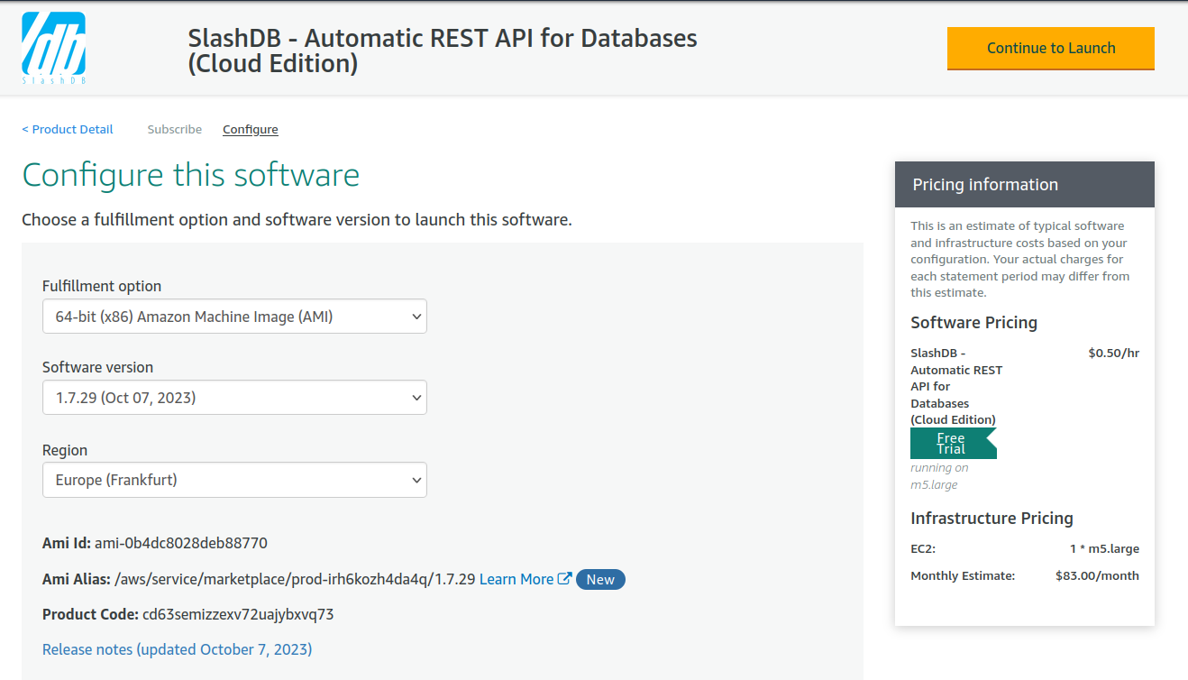 1. Go to the SlashDB product page and click the Continue to Subscribe button.