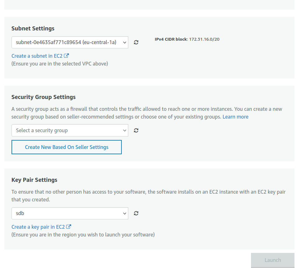 - In the Key Pair Settings section, select the key pair that will be used for connecting through SSH. If you don't have a key pair, you can create one by clicking the Create a key pair link.