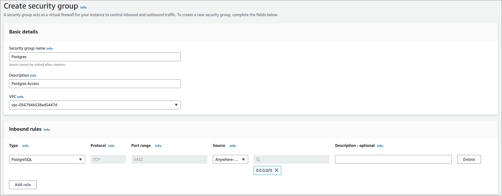 The example below allows access to a PostgreSQL database using port 5432 from any IP address.