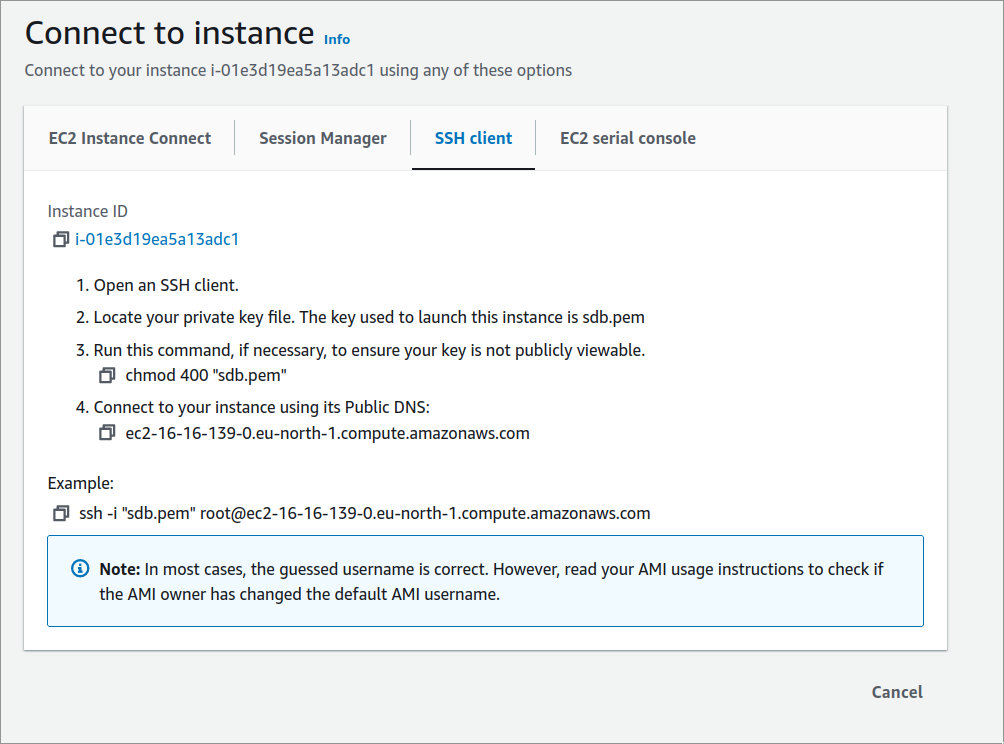 9. If you wish to log into your SlashDB server using SSH, select your instance list and click Connect, then follow the displayed instructions.