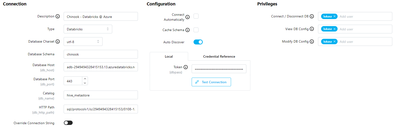 The edit form is divided into three sections: Connection, Configuration, Privileges