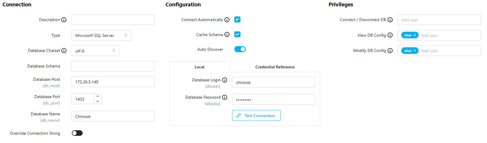 The edit form is divided into three sections: Connection, Configuration, Privileges