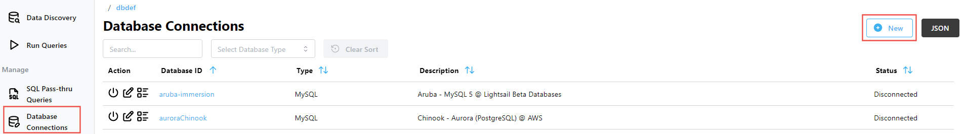 To edit an existing database connection, go to the Database Connections list and click the Edit icon in the Actions column, or click on the database ID.