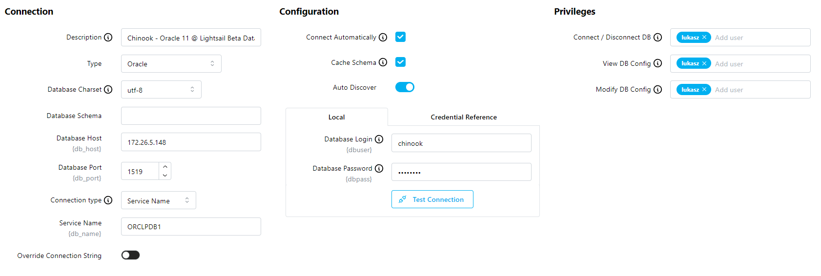 The edit form is divided into three sections: Connection, Configuration, Privileges
