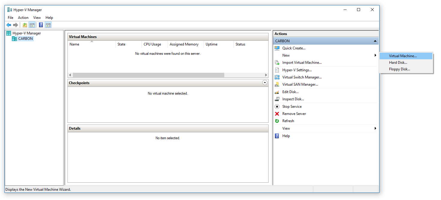 In Hyper-V Manager in side panel Action click on New -> Virtual Machine