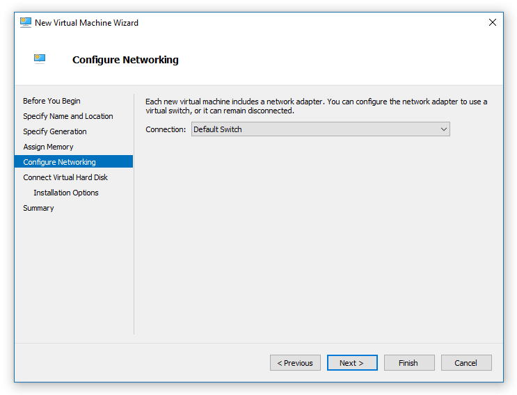 Use Default Switch for networking if you don't have specific preferences. It should assign IP address to that virtual machine.