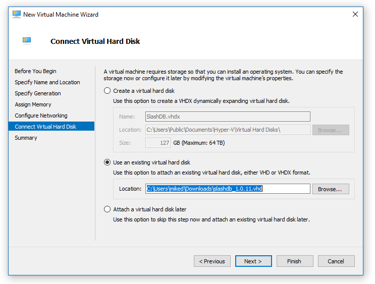 At storage step select Use an existing virtual hard disk and browse for earlier downloaded and unzipped VHD file.