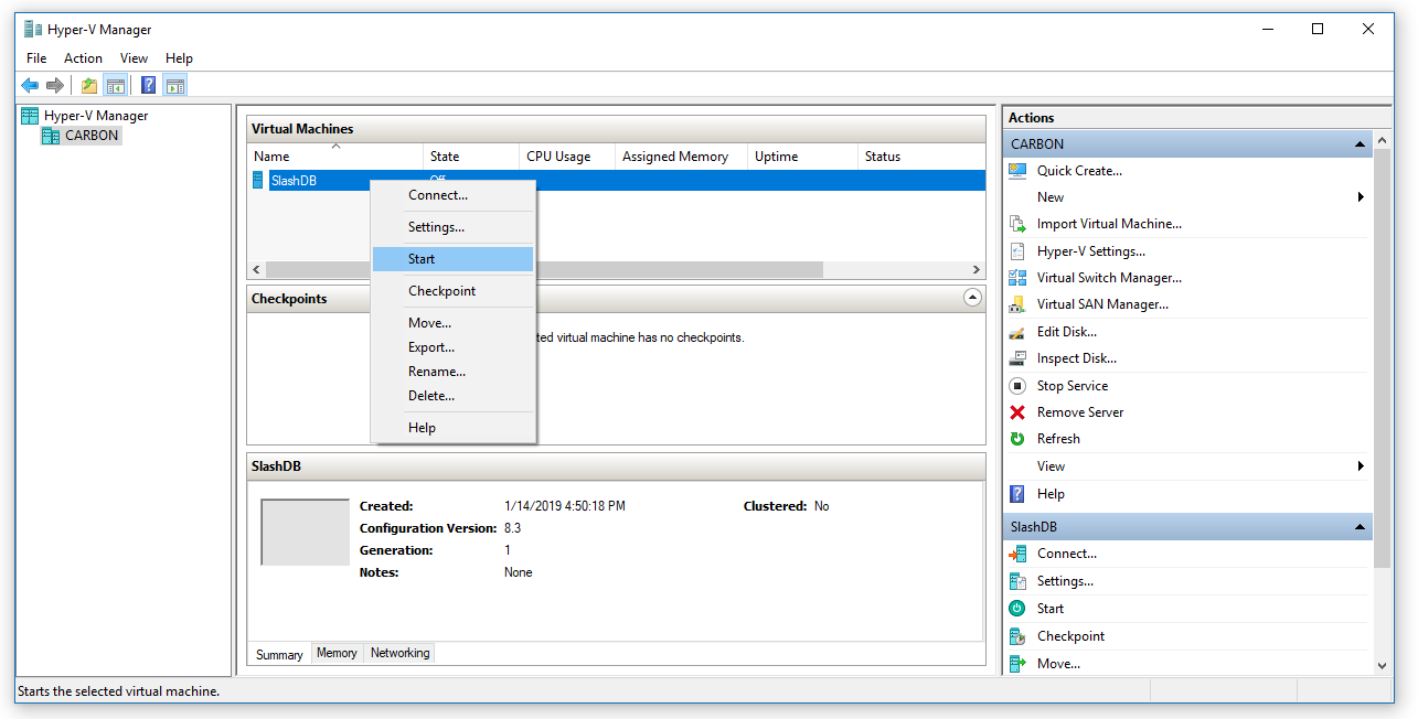 Find just created virtual machine on the list, open context menu with mouse right click and choose Start