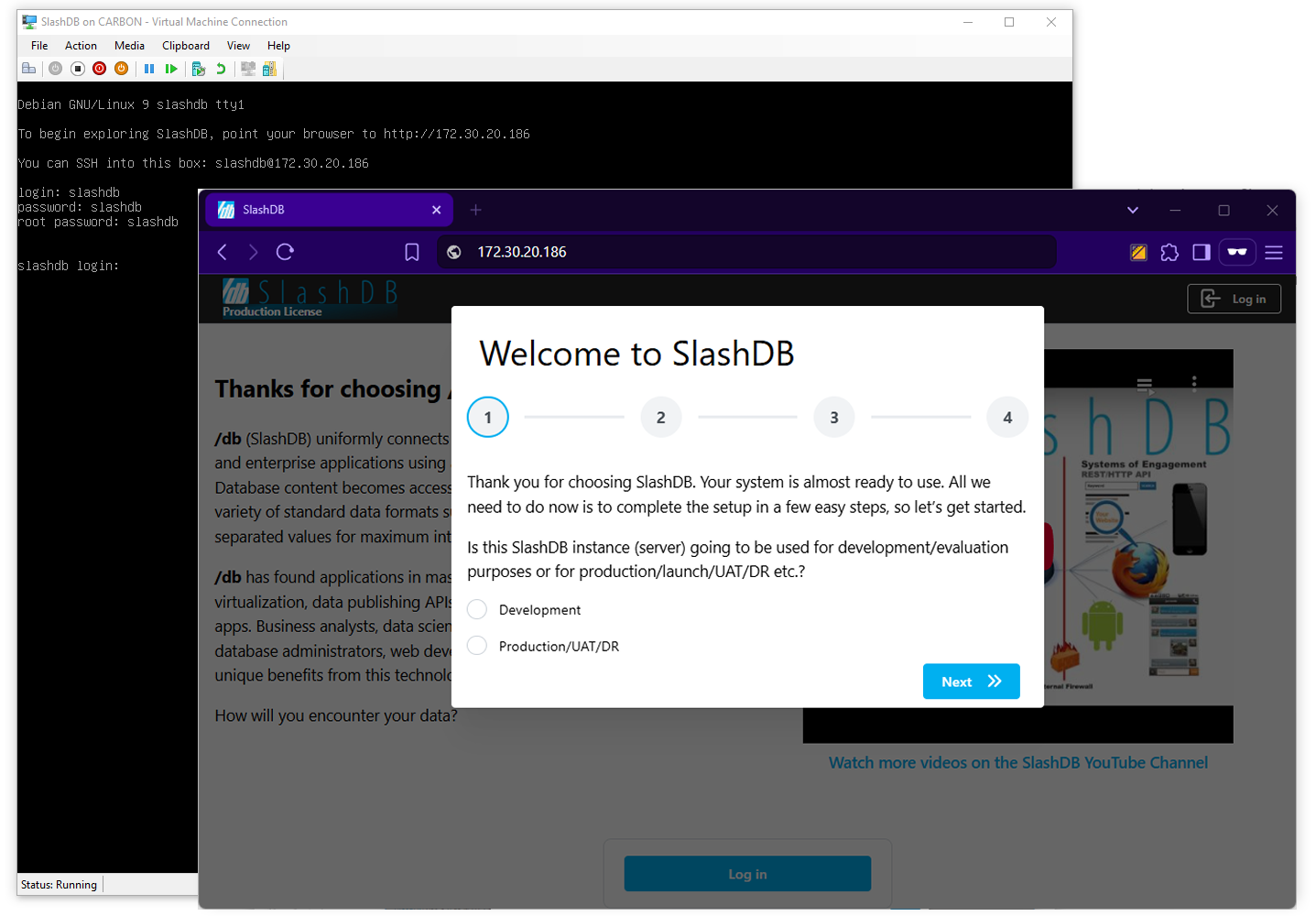 The virtual machine with SlashDB will start booting, it will obtain IP address from DHCP server and you will see a welcome message displaying that IP address. If it's not shown means that virtual machine didn't get the IP and you need to fix network configuration..