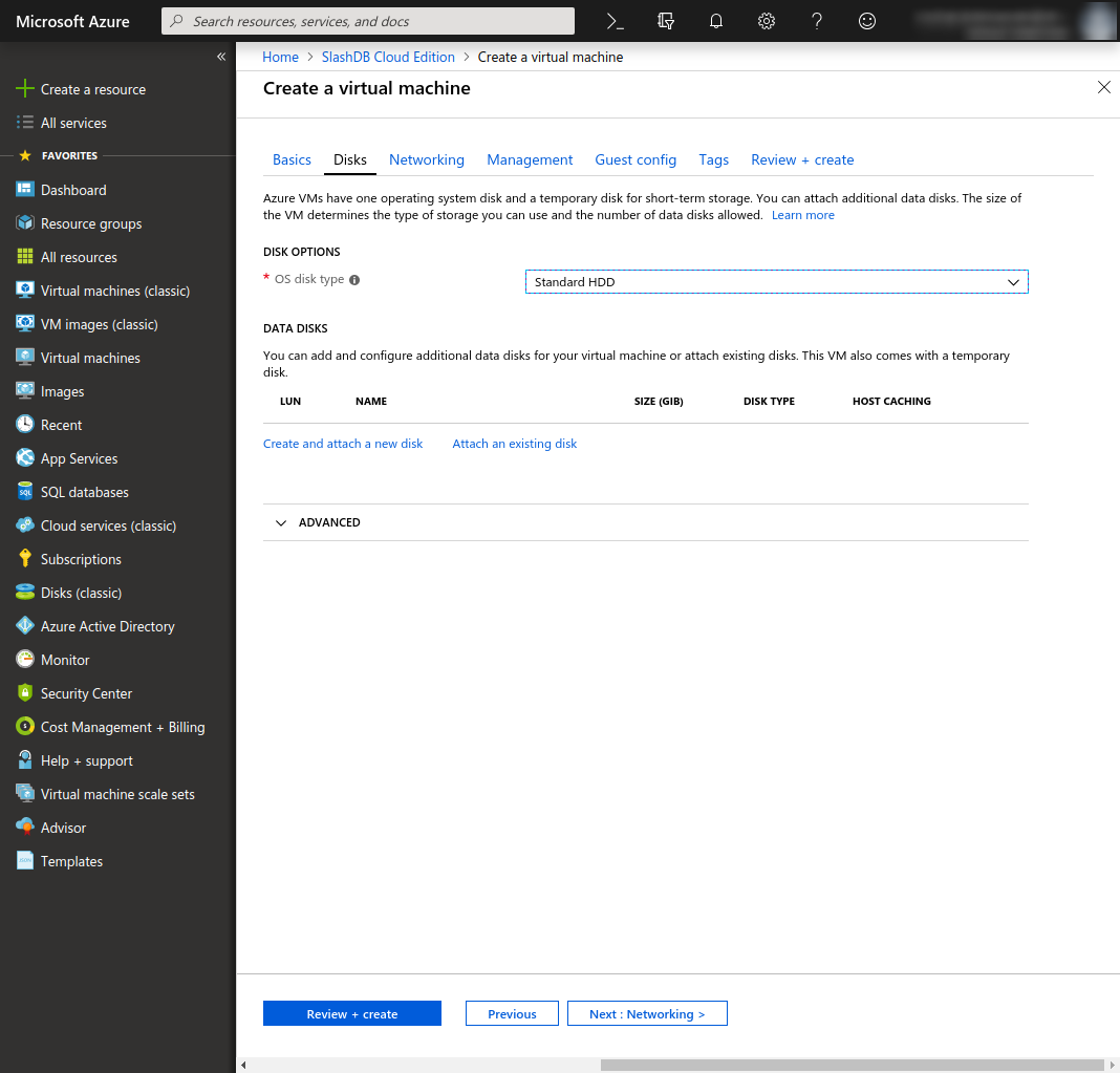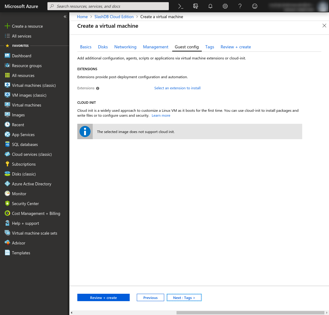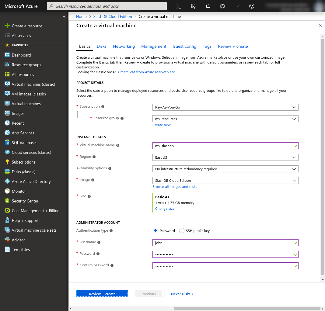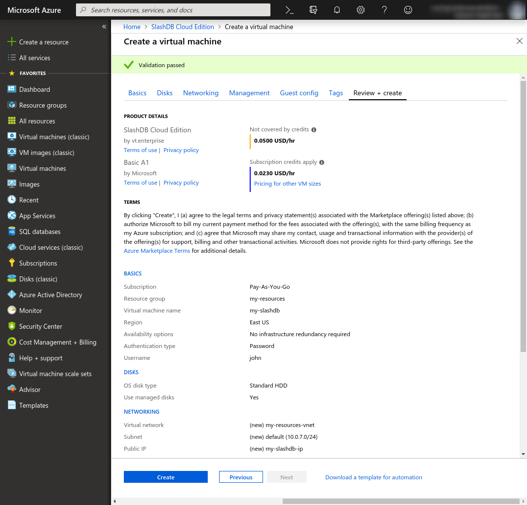 Review + create: Have a look at the summary and when your configuration validates successfully you may click Create to launch the VM.