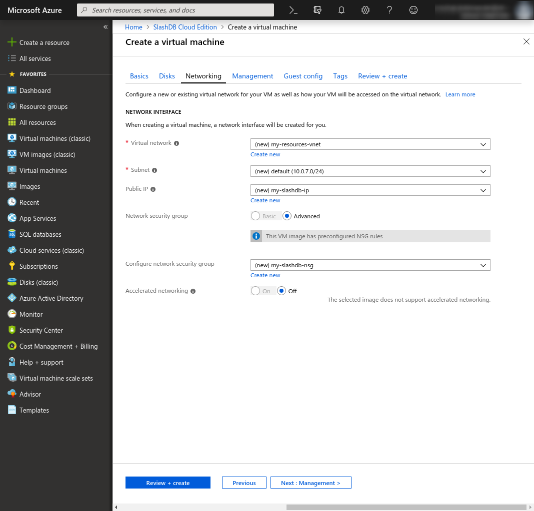 Networking: The default setup will allow connections to VM on ports 22, 80 and 443.
