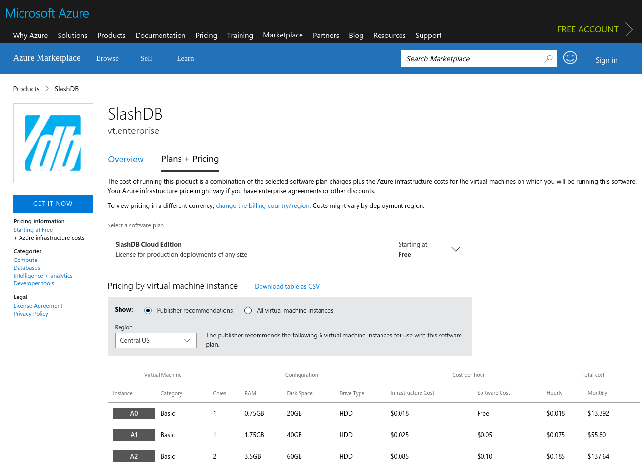 1. To instantiate a VM with SlashDB, point an internet browser to (https://azuremarketplace.microsoft.com/en-us/marketplace/apps/vte.slashdb), and click GET IT NOW.