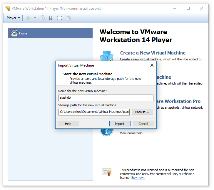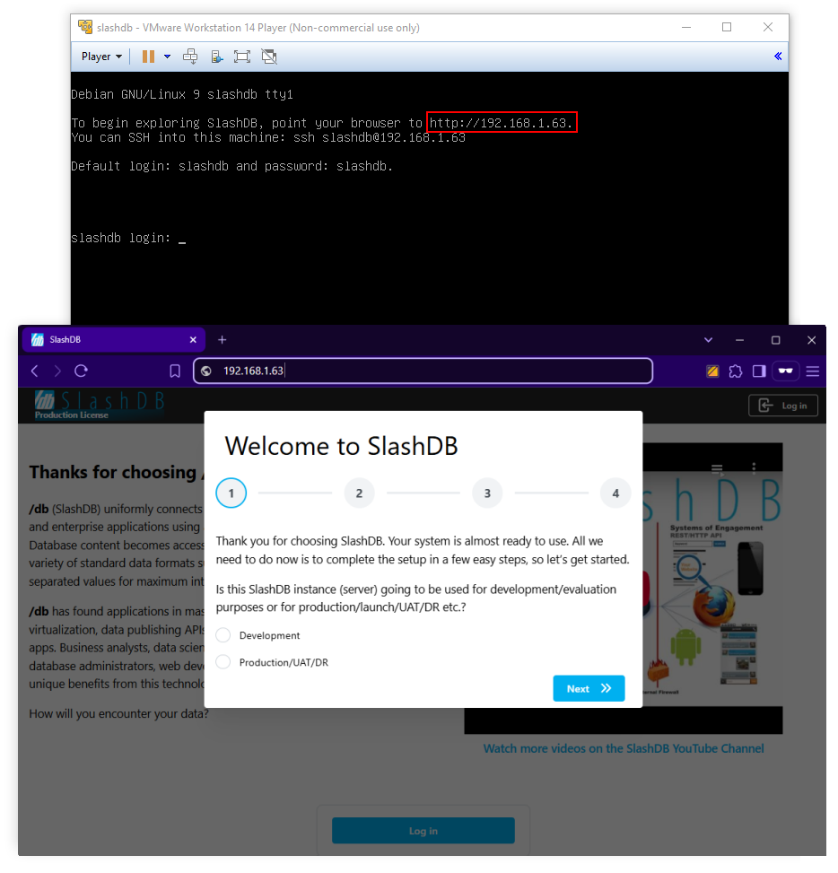SlashDB ships fully configured as a virtual machine image for VMWare. VMWare allows for a fully functional SlashDB server in one download that avoids a lengthy installation process. Evaluate VMWare on a laptop then clone and reside it to an enterprise server. VMWare requires familiarity with VMWare tools such as VMWare Workstation, VMWare Player and is a relatively large download.