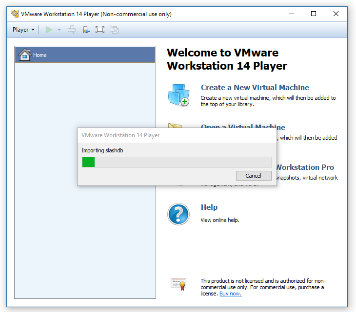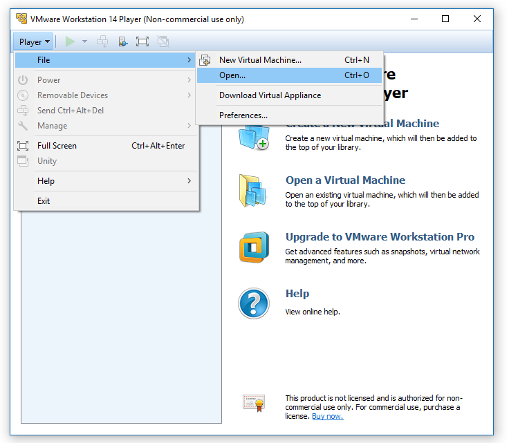 Launch VMWare and import OVA file using menu option Player -> File -> Open (Ctrl+O).