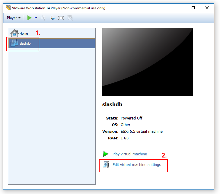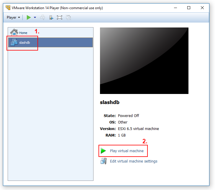 On the list of virtual machines select SlashDB vm and click Play virtual machine button.