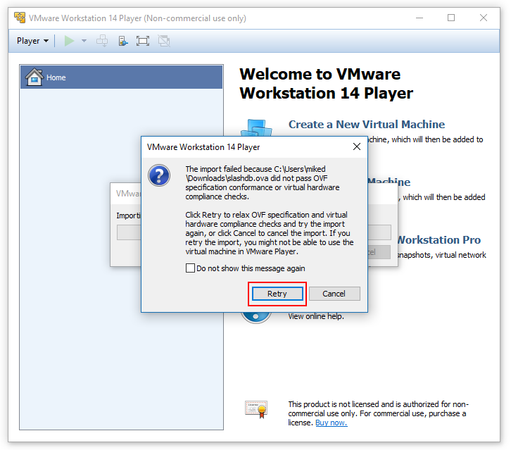 During the import you may receive warning that VM did not pas OVF specification. Click Retry to continue import.