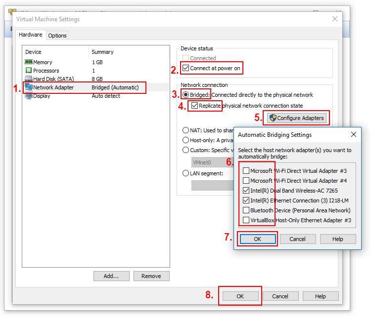 On the list of hardware components select Network Adapter, make sure Connect at power on is checked, from Network connection select Bridged and check Replicate physical network connection state. Next click on Configure Adapters to see list of available network adapters and select only those that are real network interfaces. Confirm everything with OKs and return to the list of virtual machines.