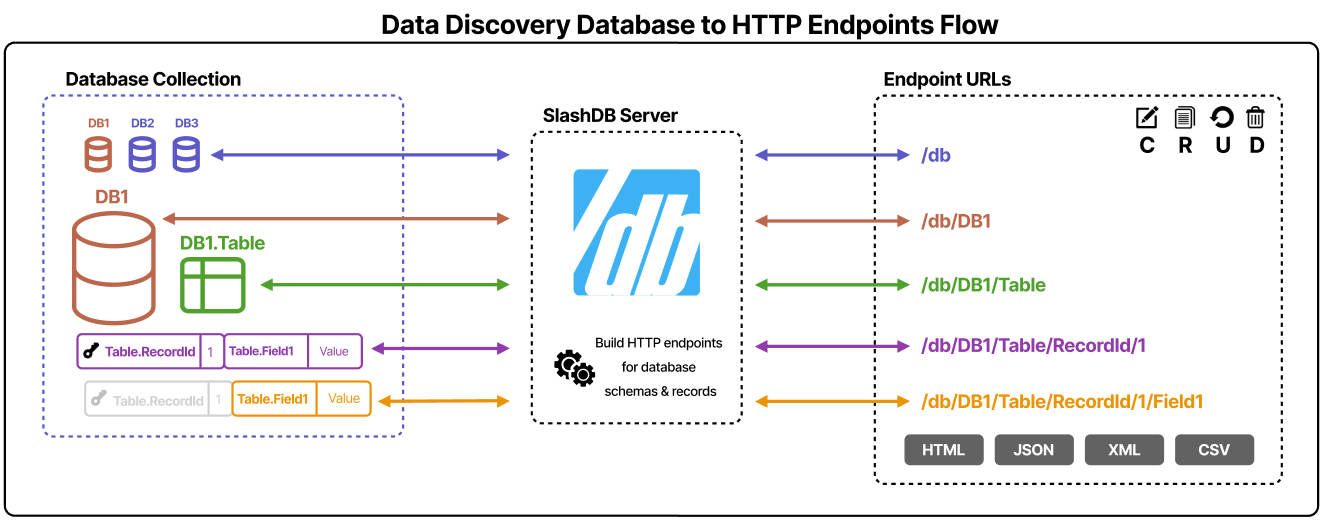 Automatic API Generation: SlashDB automatically generates RESTful endpoints based on your database schema (tables, columns, relationships).