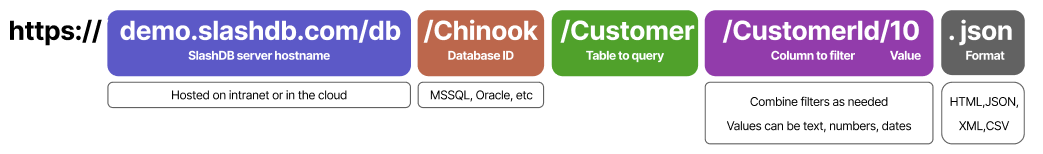 https://demo.slashdb.com/db/Chinook/Customer/CustomerId/10.json URL segments: