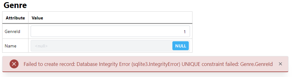 For example, if you try to create a new record with a primary key value that is already in use by another record (e.g. set the GenreId to a value that is already taken), an error message will appear.