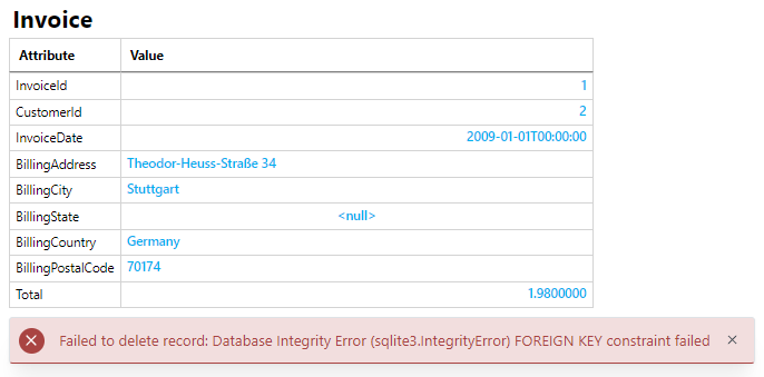 For example, trying to delete the /db/Chinook/Invoice/InvoiceId/1.html record will display an error. This is expected since the record is referenced by another table via a foreign key, so the database engine prevented deletion of the record.