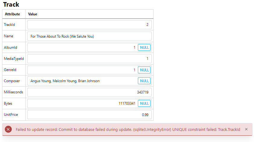 For example, if you try to update a record's primary key value to a value that is already in use by another record (e.g. modify the TrackId to a value that is already taken), an error message will appear.