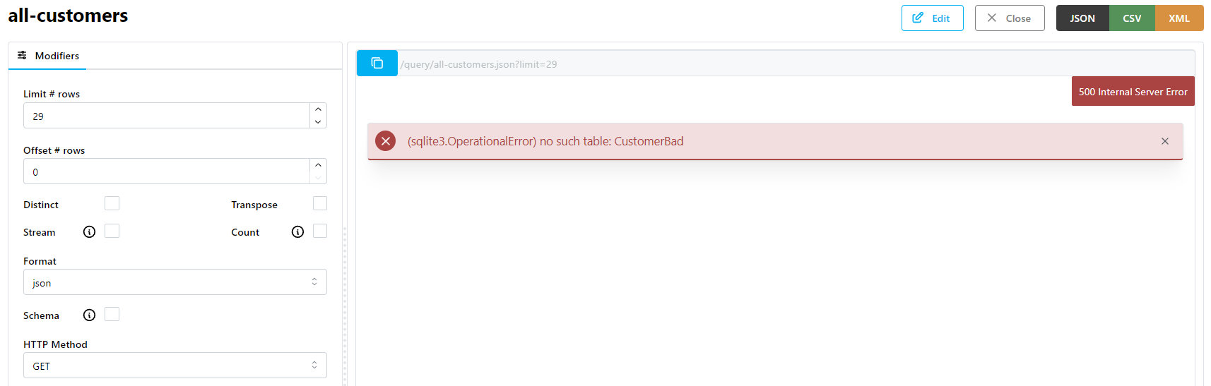 /query/customers-in-city/city/{city}.xml,500,(sqlite3.OperationalError) no such column: BadColumn