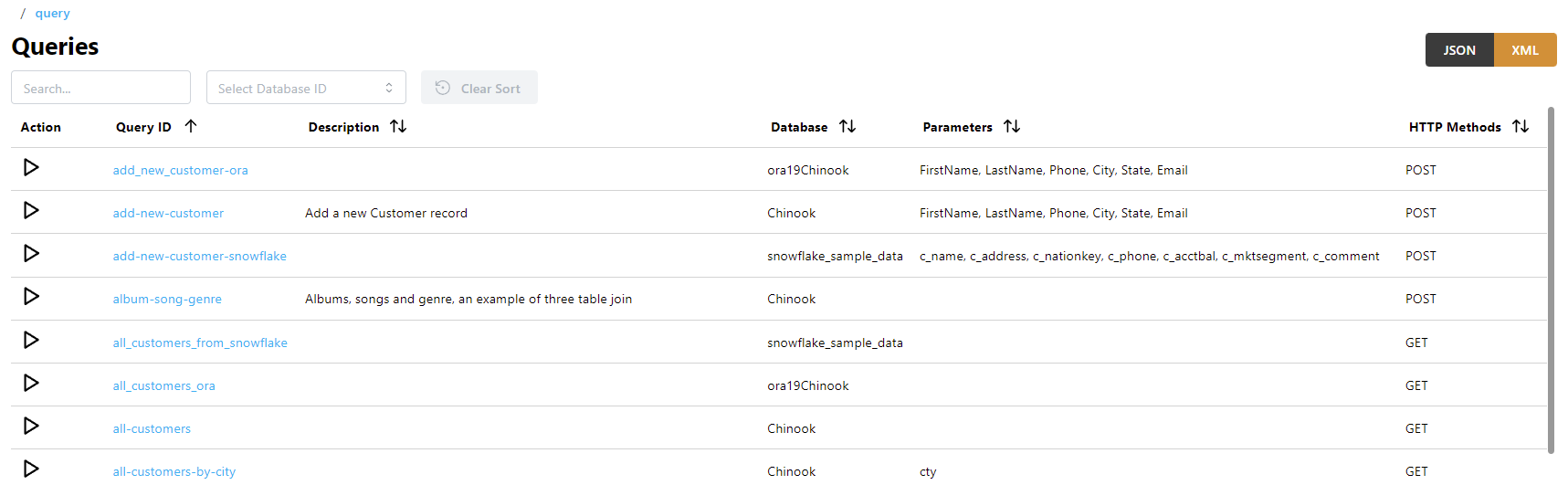 The list can be searched using the Search field above the list or sorted by clicking on column headers. The Select Database ID dropdown filters queries by the database they are associated with.